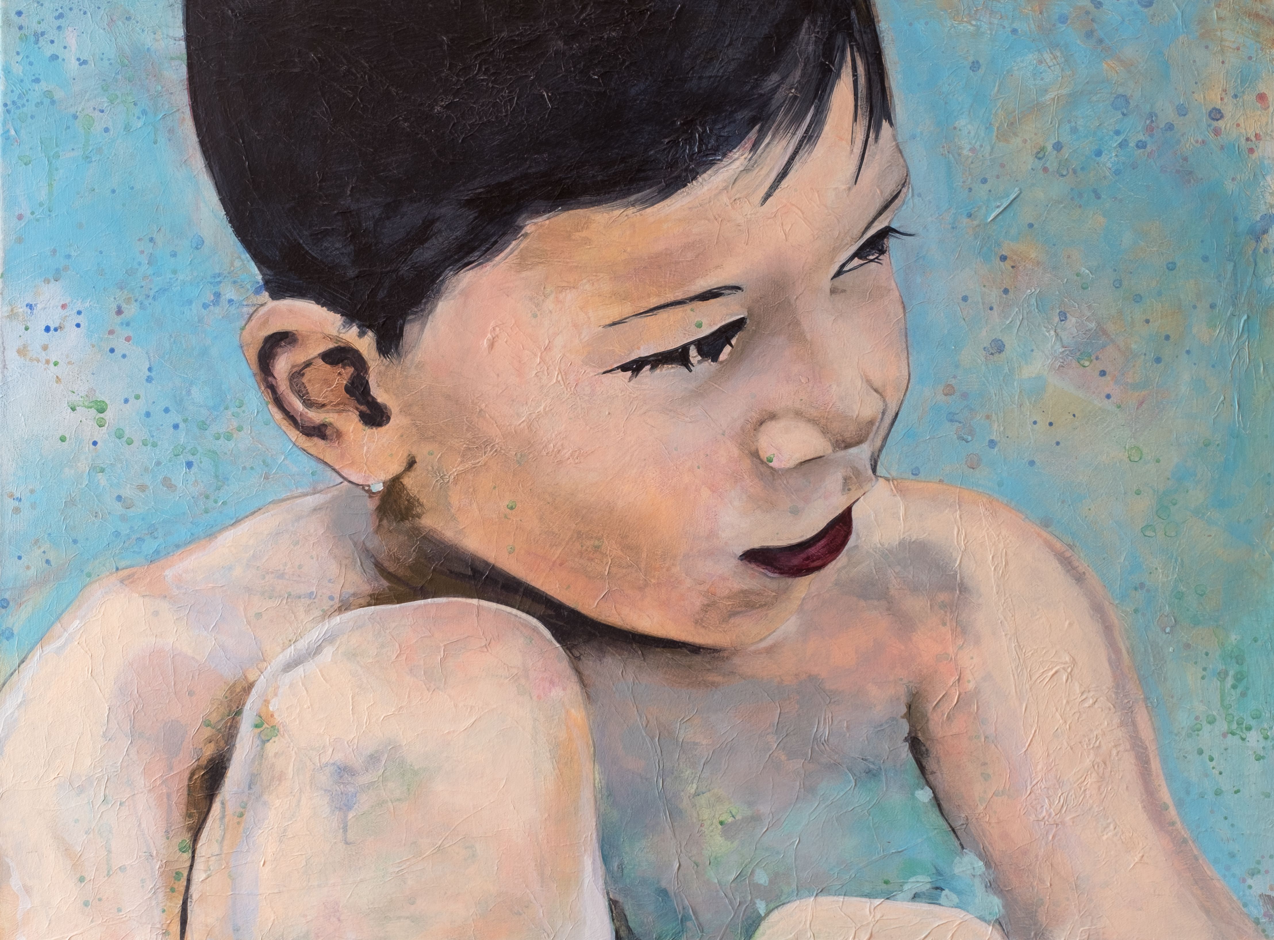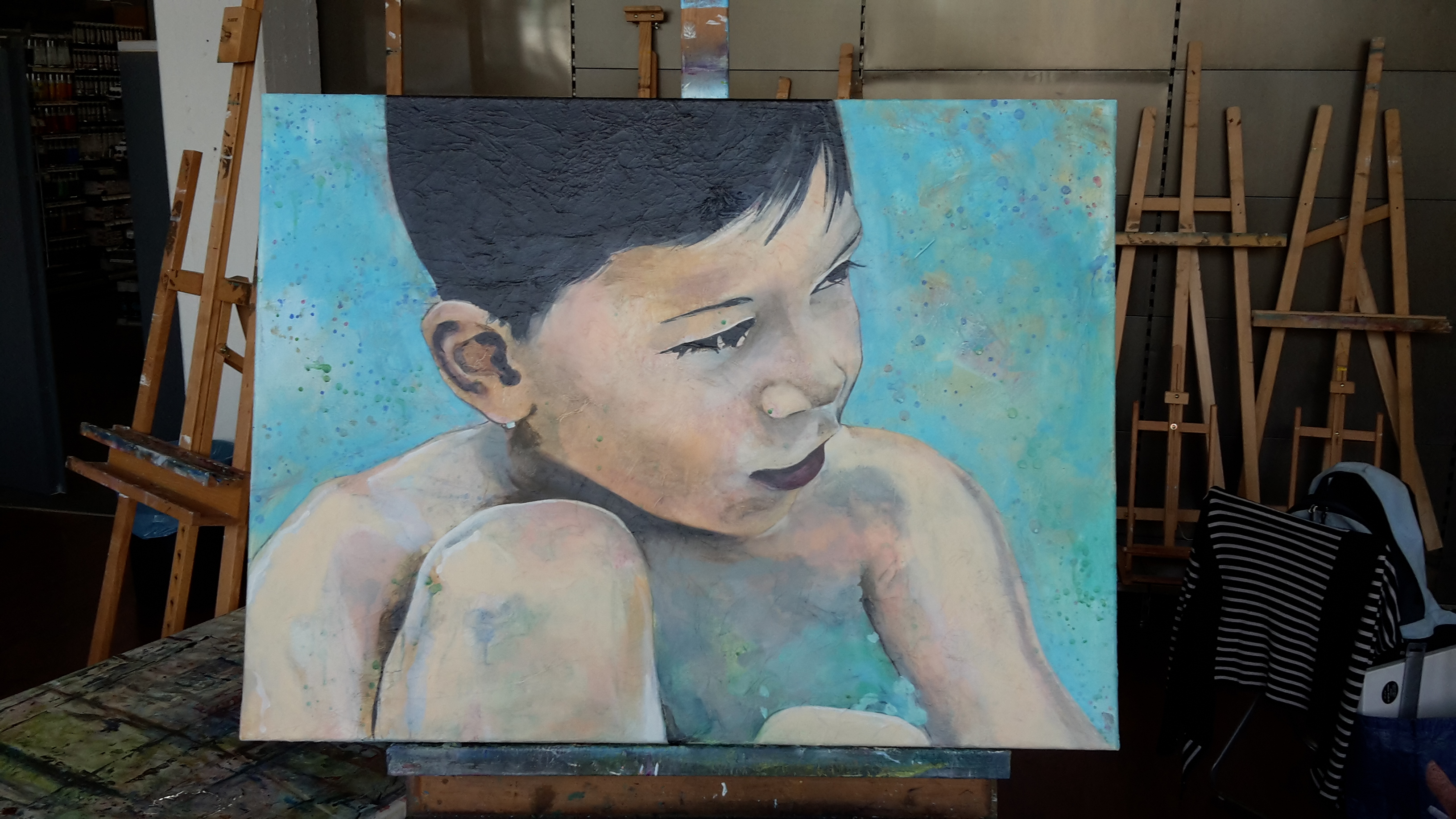 Die Bildidee „Junge im Pool“ wurde fortgesetzt. Das Bild „Junge im Pool 2“ wurde in einer neuen Lasurtechnik in Acrylfarbe und einer markanten Leinwandstruktur umgesetzt. Es ist ein weiteres Bild der Griechenland-Reihe.